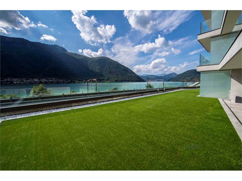 Due ampie camere con vista lago con accesso a all'ampia terrazza coperta di 21 mq e giardino con prato sintetico 100 mq. Ampio locale deposito/ lavanderia.