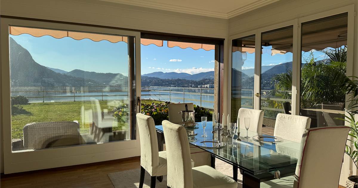 Fin dall’ingresso, la proprietà conquista grazie a una vista lago a 180° straordinaria: il golfo di Lugano, la città, il Monte San Salvatore e le montagne circostanti creano un quadro scenografico unico.