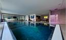 The ground floor accommodates a two-room apartment with a separate entrance (living room with kitchen, bedroom with en-suite bathroom), a service/guest room, a bathroom, a utility room, a laundry room, a home cinema, a wellness area with a heated indoor pool, a whirlpool, sauna, steam room, fitness room, shower, bathroom, dressing room, technical room, a garage of 100 square meters for 4 cars, and two external parking spaces.